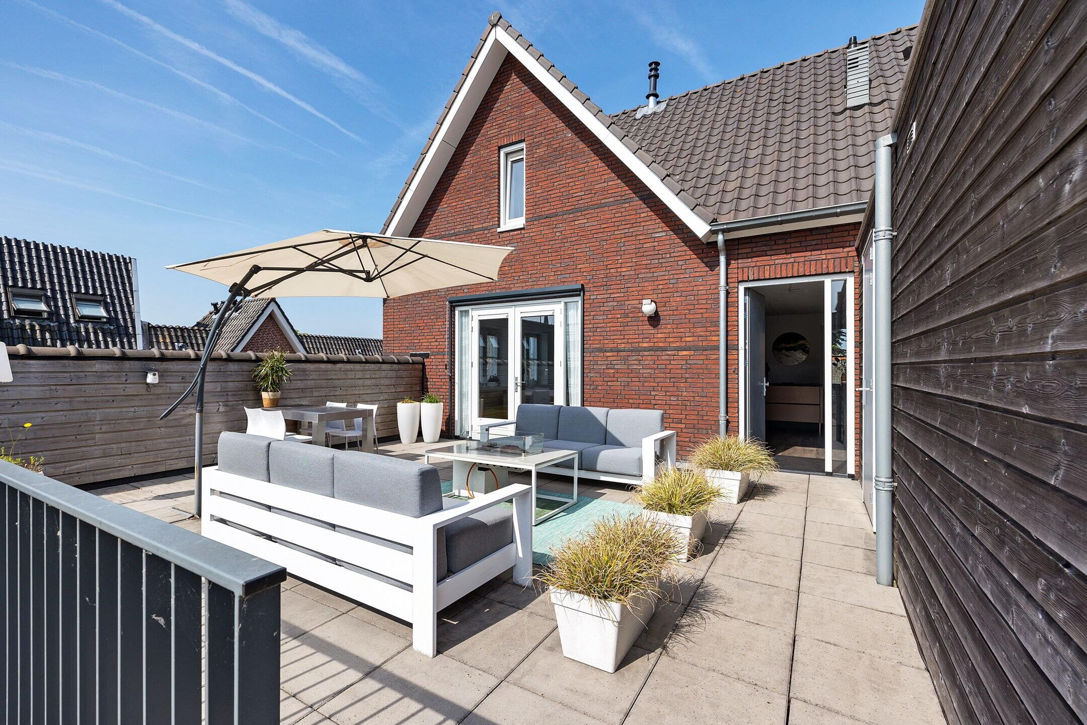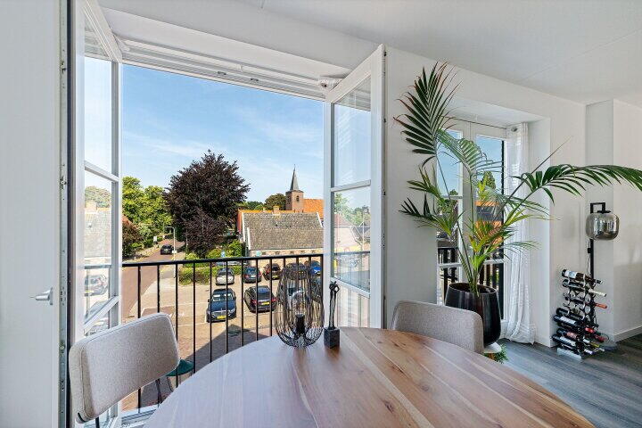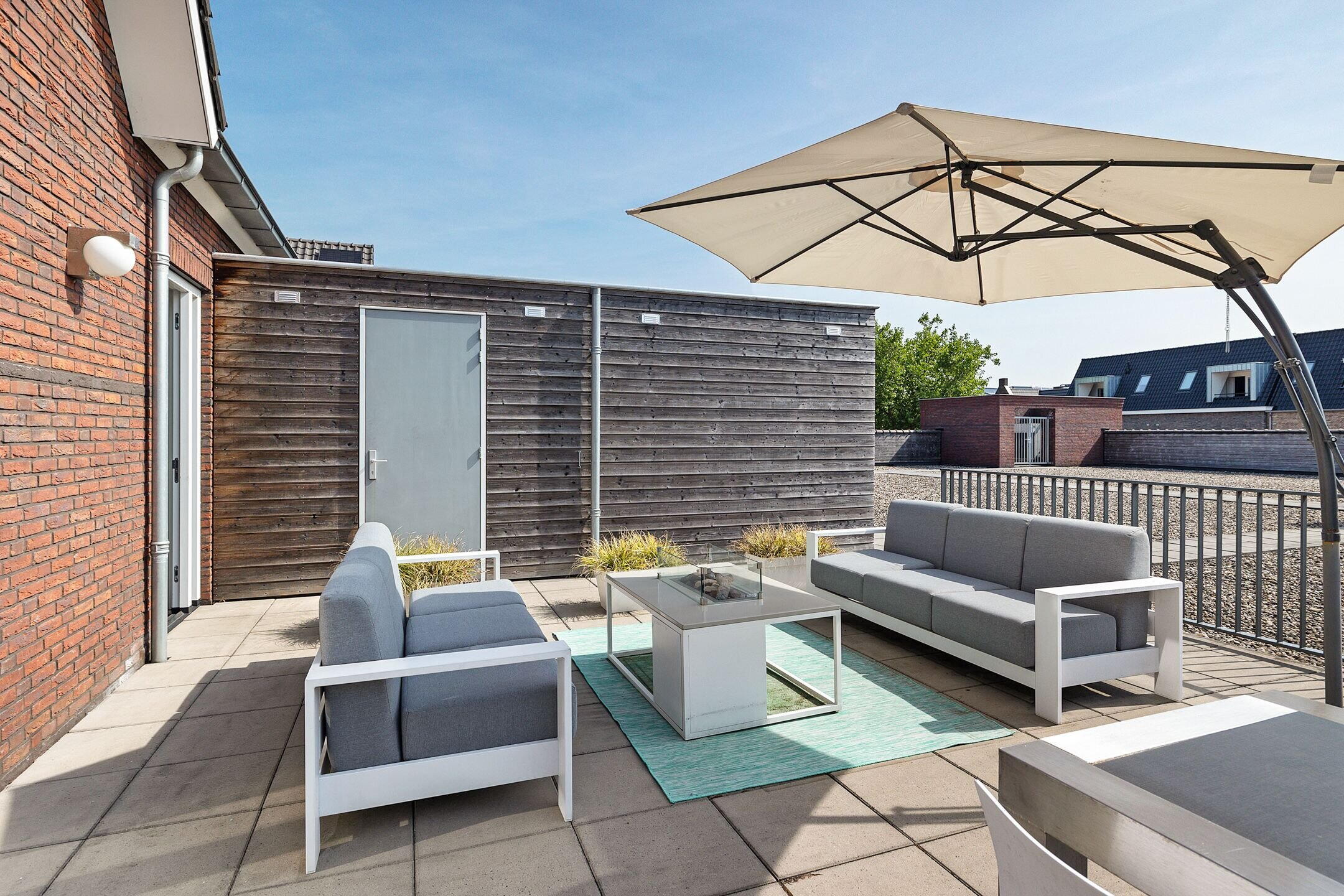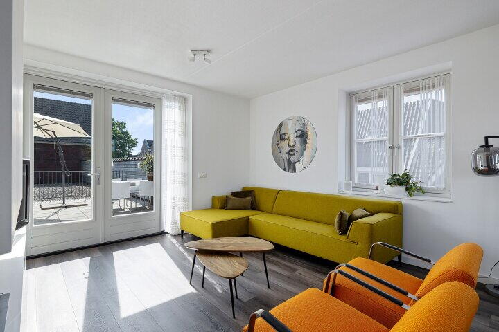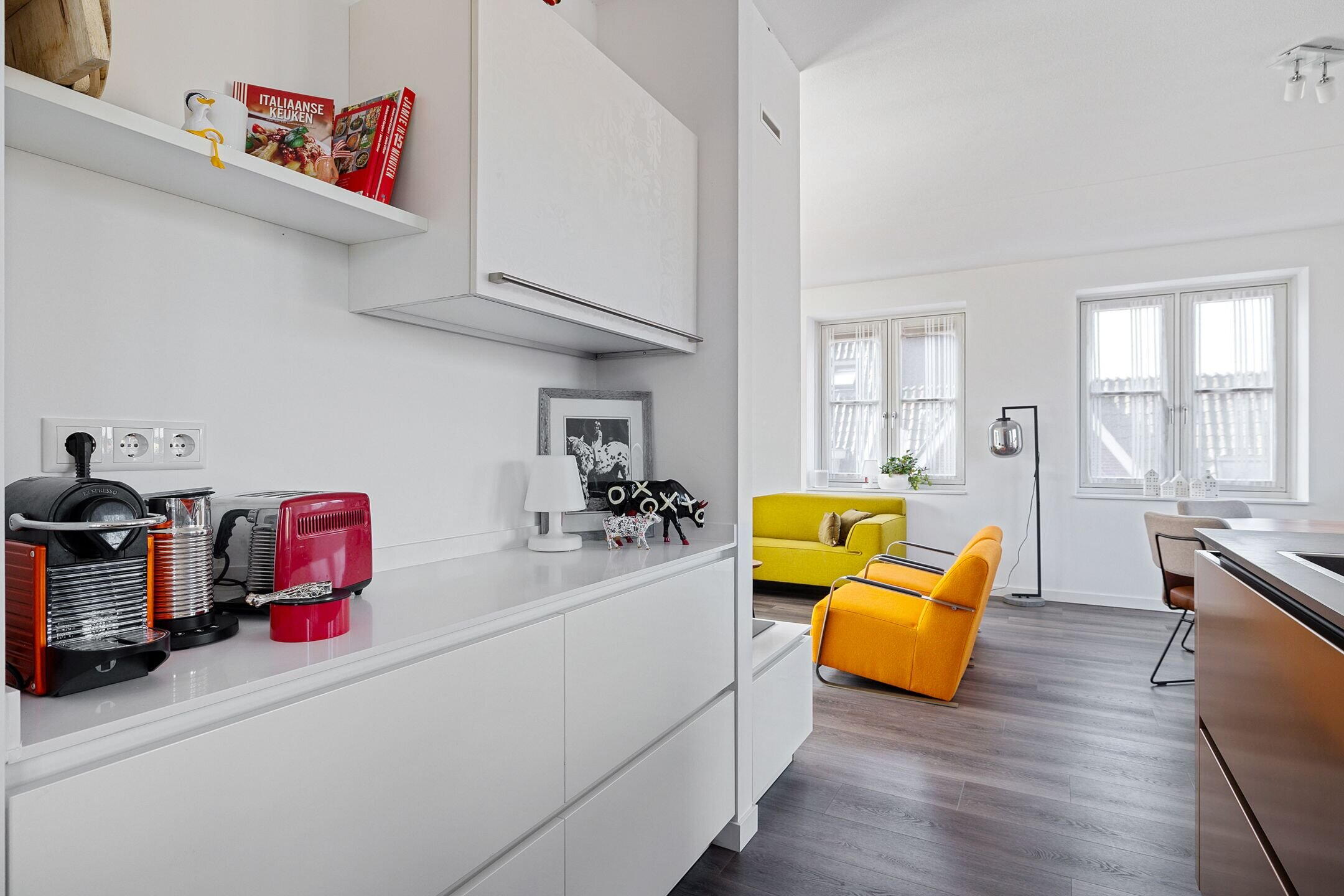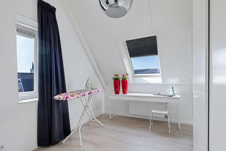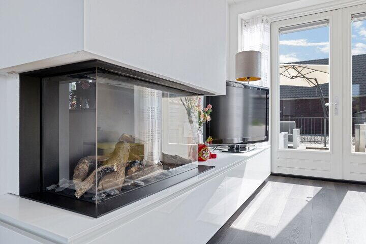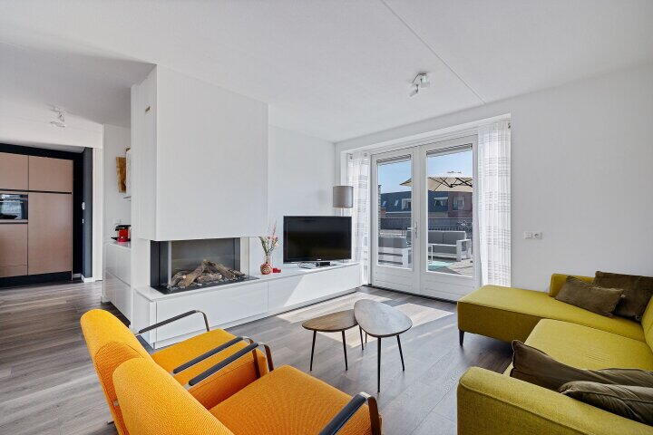 Vervolgens krijg je de heerlijke ruime en lichte woonkamer (aan 3 zijden glas, 2 Franse balkons) en deze beschikt over een eigen gashaard, dat zie je niet veel bij appartementen. Via openslaande deuren kom je op het riante dakterras van 42 m², hier is handig een eigen berging voor de kussen en overige opslag.