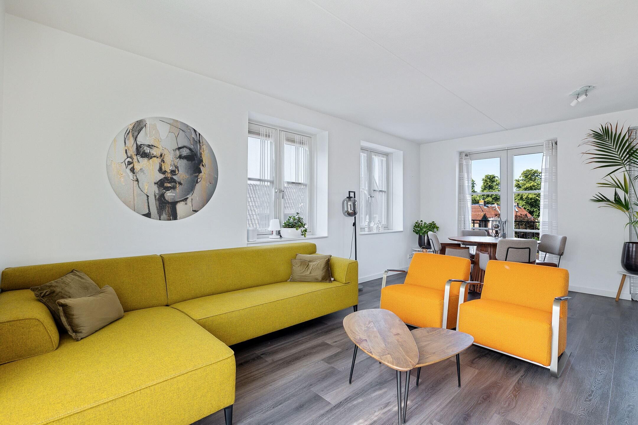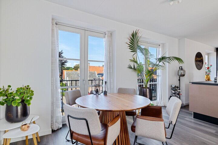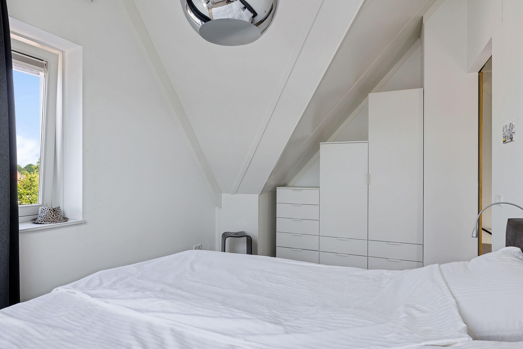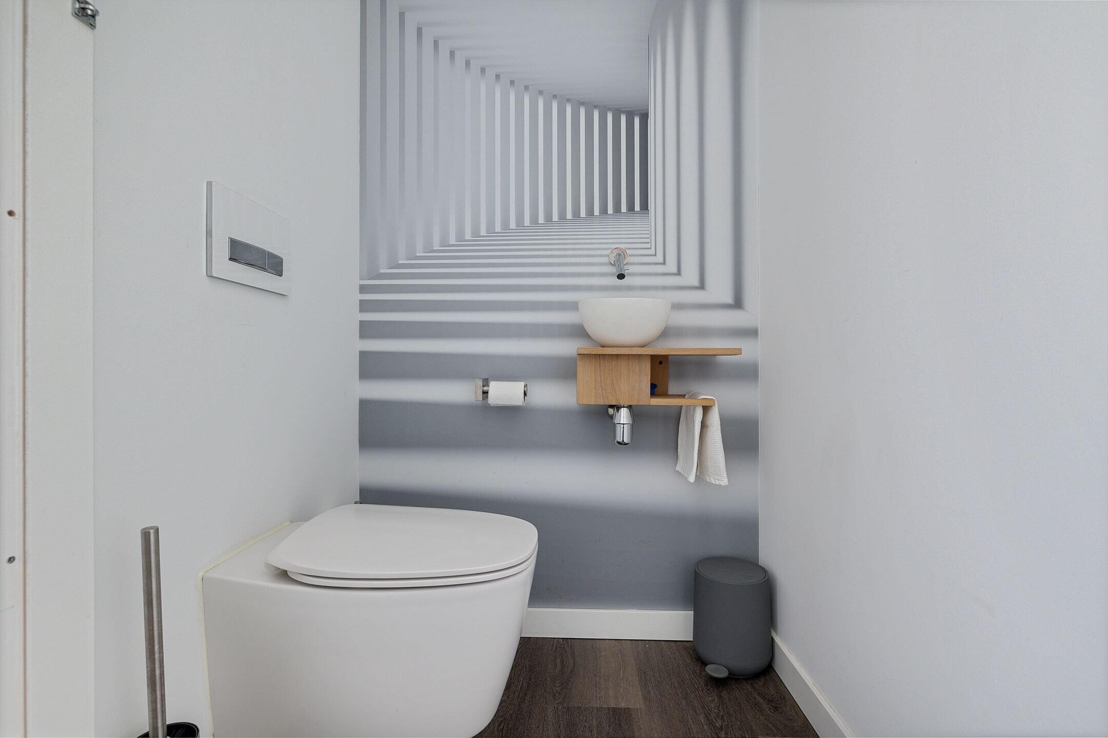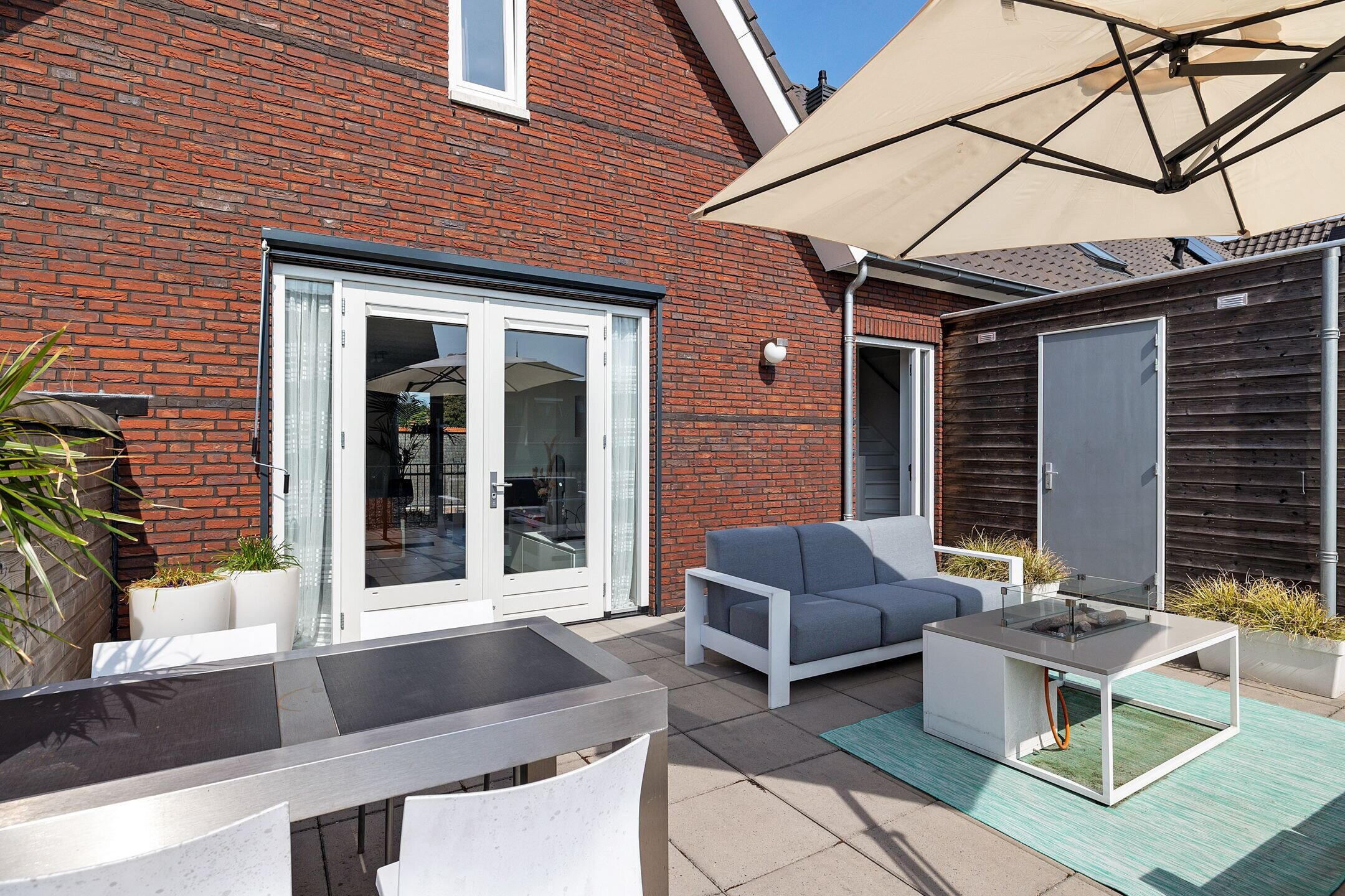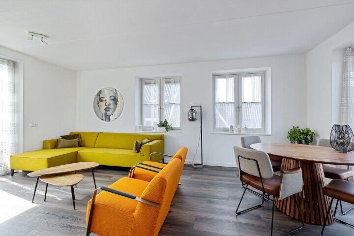 Vervolgens krijg je de heerlijke ruime en lichte woonkamer (aan 3 zijden glas, 2 Franse balkons) en deze beschikt over een eigen gashaard, dat zie je niet veel bij appartementen. Via openslaande deuren kom je op het riante dakterras van 42 m², hier is handig een eigen berging voor de kussen en overige opslag.